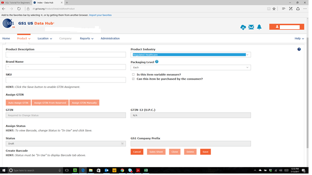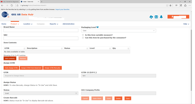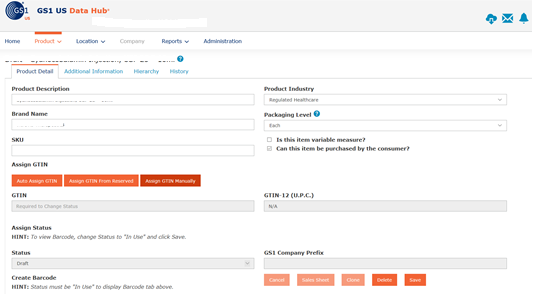 button. - Automatically the GTIN 12 U.P.C. and the Company prefix will populate on the screen and the Status will default to "Draft". If the Status is incorrect, correct the Status for the product and all the information on the screen, after checking the information, click on the