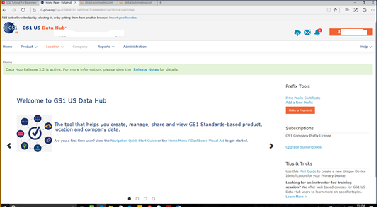 - After successfully entering the Company's email and password you will get to the GS1 US Data Hub main screen: