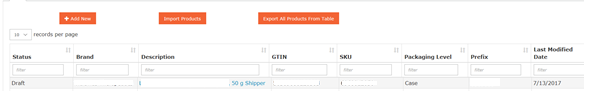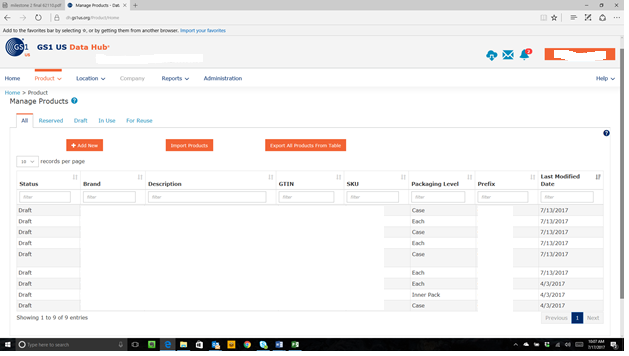 - Go to "Product" then "Manage" option and you will see the list of products already entered in the Data Hub. It will be empty, if no products have been entered yet: