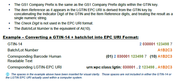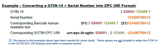 - Cardinal: <epc>urn:epc:id:sgtin:030009.0307301.1130242</epc>